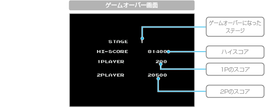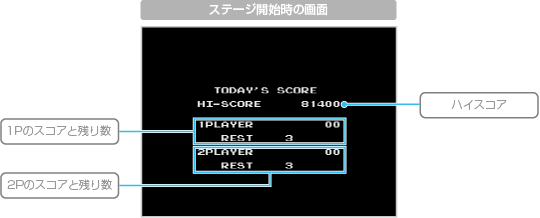 1人プレイ時のステージ画面の見かたです。なお、1人プレイ時は1Pと2Pの ![]() |