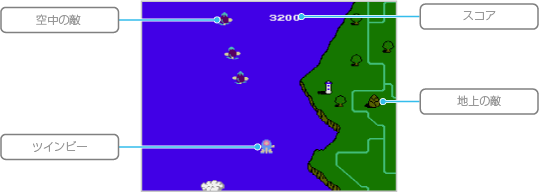 ツインビーまたはウインビーを操作して、空中の敵は空中攻撃で、地上の敵は地上攻撃で倒しながら進みましょう。敵が撃った弾に当たるとアームが壊れ、アームがない状態で敵や敵の弾に当たると爆発してプレイヤーの残り数が減ります(アームがある状態でも、敵に当たると爆発します)。プレイヤーの残り数がすべてなくなるとゲームオーバーになり、ゲームオーバー画面で ![]() ![]() |