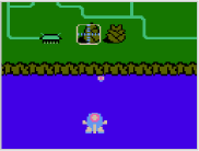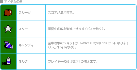 を押すと、自動的にロックオンしてボムを投下します。なお、地上の敵を倒すと、アイテムが出現します。