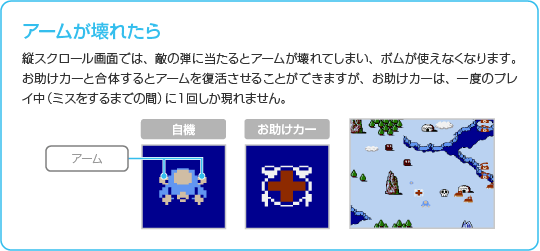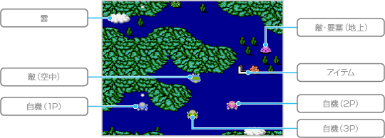 ステージによって、画面が横スクロールのときと、縦スクロールのときがあります。なお、プレイ人数にかかわらず、1Pの |