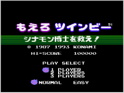 Wii本体の電源を入れたら、Wiiメニュー画面で『もえろツインビー シナモン博士を救え!』のチャンネルを選んでください。タイトル画面が表示されます。 |