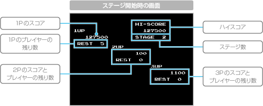横スクロールのときの画面の見かたです。下の画面は1人プレイ時のものです。 ![]() |