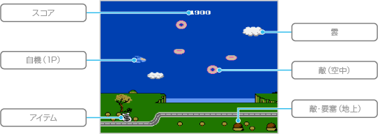 ツインビーたちを操作して、空中の敵をショットで、地上の敵や要塞をボムで倒しながら進みます。敵に当たるとミスになり、プレイヤーの残り数が1つ減ります。敵の弾に当たると、横スクロールのステージではミスになり、縦スクロールのステージではアームが壊れます(アームがない状態で敵の弾に当たるとミスになります)。プレイヤーの残り数が0になるとゲームオーバーになり、「ゲームオーバー画面」に移ります。 なお、プレイヤーの残り数は、ステージ開始時の画面で確認できます。 ![]() |