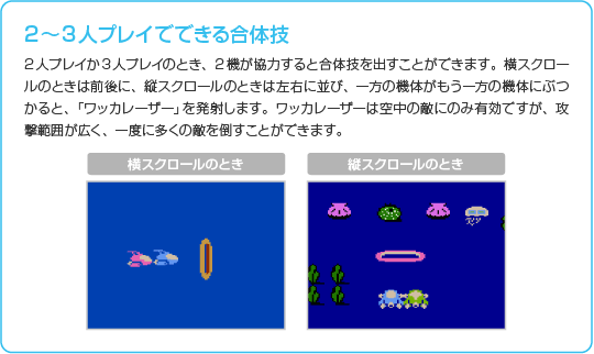 を押すと、ショットとボムを同時に発射します。正面に発射されるショットで空中の敵を攻撃し、前方から下に向かって発射されるボムで地上の敵や要塞を攻撃することができます。地上の敵を倒したり要塞を破壊すると、アイテムが出現することがあります。また、ショットで雲を撃つとベルが出現することがあります。