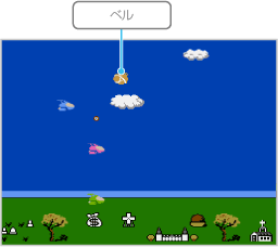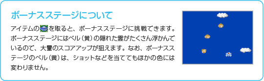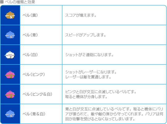 雲の中にはベルが隠れていることがあり、ショットやハートを雲に当てると出現します。ベルにショットやハートを当てると、当てた回数によって色が変わり、取ると下のような効果があります。