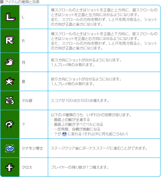 地上の敵を倒したり、要塞を破壊したりすると、アイテムが現れることがあり、取ると下のような効果があります。