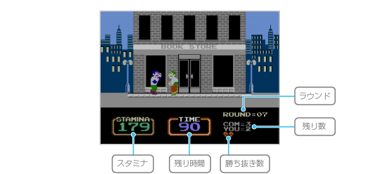 パンチをうまく当てて、相手を画面の端へ追いつめましょう。 相手のパンチはガードをしたり、よけて防ぐことができます。 画面の外へ転がると残り数が減ります。 |