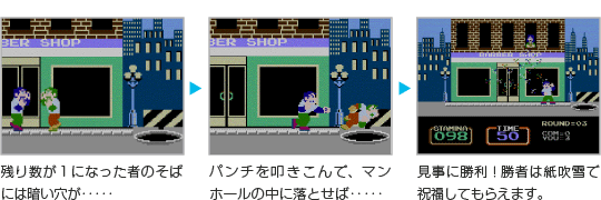 残り数が1になると、画面の端にフタの開いたマンホールが現れます。 相手を追いつめて、マンホールの中に落とすと勝ちです。 ![]() |