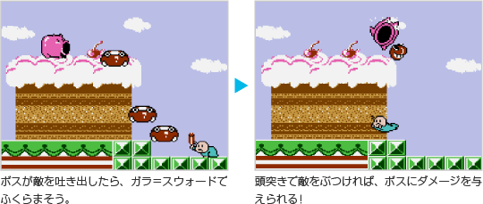 エリアの奥には、敵のボスがいる場合があります。ボスはガラ=スウォードでふくらませることができず、敵を次々に生み出してきます。このような戦いでは、以下のように敵とガラ=スウォードをうまく使い、何度も攻撃してボスを倒しましょう。 |