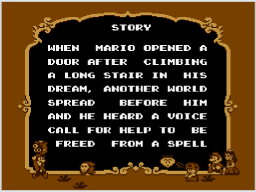 上の方にある扉へと続く、長い長い階段の夢でした。 扉を開けると、いままで見たこともない世界が見渡すかぎり広がっていました。 耳をすますと、かすかに声がします。 「夢の国、“Subcon(サブコン)”へようこそ。私たちはマムーに苦しめられ、国中にひどい魔法をかけられているのです。あなたが来てくださるのをお待ちしていました。 マムーを倒してSubconをもとの姿に戻してください。現実の世界でマムーがあなたにかけた呪いは、夢の世界では効果がありません。いいですか、マムーは野菜が苦手だということを覚えておいてください。どうか私たちを助けてください!」 この声と同時に、マリオの目の前に稲妻が走りました。 マリオはびっくりして足をすべらせ、ひっくり返ってしまいます。 はっとおどろいて目が覚めると、ベッドから起きあがっていました。 頭をすっきりさせようと思い、マリオはこの不思議な夢のことを ルイージとキノピオとピーチ姫に話しました。 その後マリオたちが、近くの山にピクニックに出かけたときのこと。 目的地に着いて、あたりをながめると、近くに小さなほら穴がありました。 ほら穴に入ると上へ上へと続く階段がありました。 これはマリオが夢で見たものとまったく同じです。 みんなで階段をいちばん上まで登ると、そこにもマリオが夢で見たものと同じ扉がありました。 そしてマリオたちが、おそるおそる扉を開けてみると…… 驚いたことに、マリオが夢で見た世界が目の前に広がっていたのです。 |