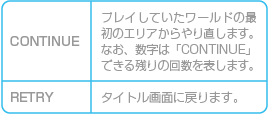 プレイヤーの残り数が0のときにミスすると、ゲームオーバーになり、「CONTINUE」と「RETRY」が表示されます。 ※ゲームのコンティニューは2回までです。 ![]() |