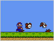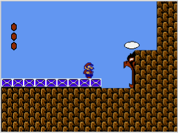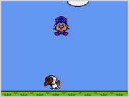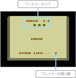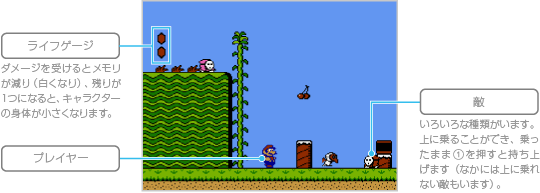 敵に横や下から触れたり、トゲなどにふれると、ダメージを受けてライフゲージのメモリが1つ減ります。ライフゲージのメモリがすべてなくなるか、穴などに落ちるとミスとなり、プレイヤーの残り数が1減って、特定のポイントからやり直しとなります。 |
