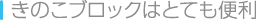 きのこブロックは、敵に投げつけて攻撃したり、高いところへ行くときに踏み台にしたり、かげに隠れて敵の攻撃をよけたりと、いろいろな使い道のある便利なアイテムです。何度でも使えるので、うまく利用しましょう。 |