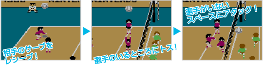 攻撃の基本は「レシーブ」→「トス」→「アタック」です。まずはこの流れをマスターしましょう。