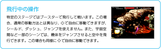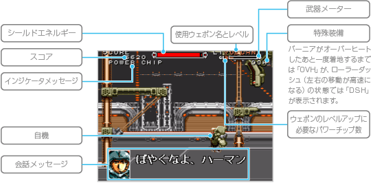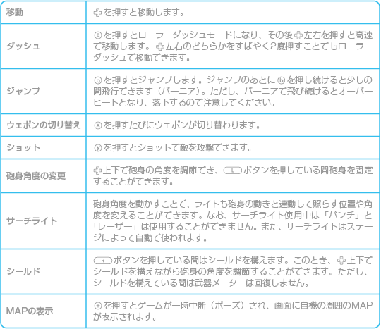 プレイヤーはアサルトスーツを操り、ステージを戦い抜きます。各ステージの開始時に表示されるステージや攻撃目標などの説明をよく確認し、ゲームを進めてください。 |
