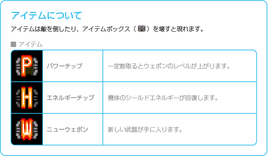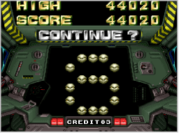 敵からの攻撃などによりシールドエネルギーがなくなるか、特定のステージで攻撃目標を一定時間内に倒せなかった場合、ゲームオーバーになります。コンティニューをする場合は9カウントの間に ※最初のステージではコンティニューできません。 |