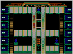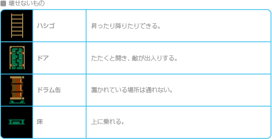 敵やファイアボールに当たるとミスとなり、プレイヤーの残り数が減って、ステージの最初からやり直しになります。プレイヤーの残り数がなくなると、ゲームオーバーです。 なお、上から落ちてきたドラム缶をかぶってしまったり、2つのドラム缶にはさまれて脱出できなくなったり、床の間にはまってしまったときなど、操作できなくなった場合は、 |