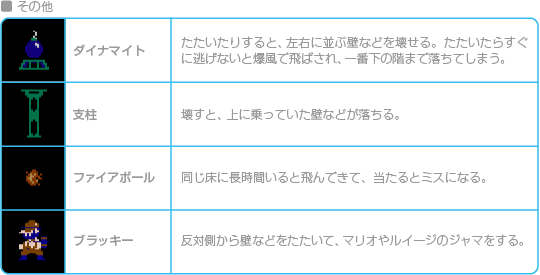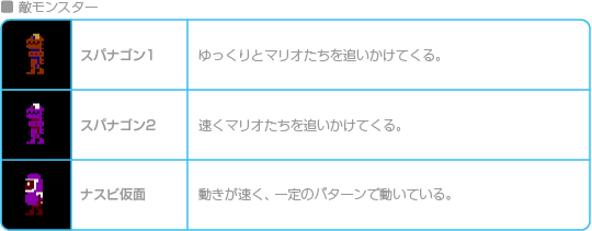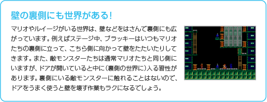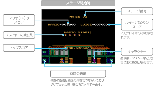 1人プレイではマリオを操作し、2人プレイでは、1Pがマリオ、2Pがルイージを操作してください。それぞれ、 特定の壁(ステージ開始時の画面スクロール中や、 なお、ステージをプレイ中に |
