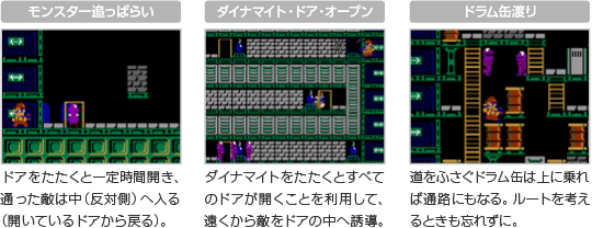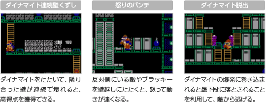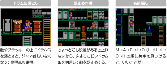 『レッキングクルー』には、ステージにあるものや敵を使った、さまざまなテクニックがあります。ここで紹介するテクニックは、使いかたひとつで有利にも不利にもなります。うっかり使って「ミス」……とならないよう、タイミングよく使いましょう。 ![]() ![]() ![]() |