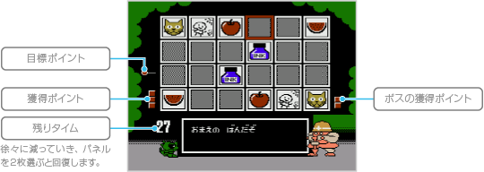 自分の番になったら、裏になったパネルを2枚選んでください。同じ絵柄のパネルを選ぶと、1ポイント獲得でき、そのままほかのパネルを選ぶことができます。残りタイムが0になるか、すべてのパネルが表になると終了です。獲得ポイントが目標ポイントを上回っていると、次のコースに進むことができます。