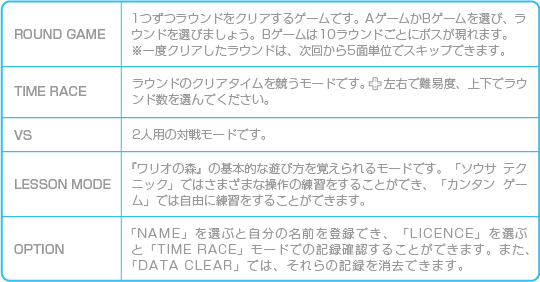 Wii本体の電源を入れたら、Wiiメニュー画面で『ワリオの森』のチャンネルを選びましょう。タイトル画面が表示されます。 |