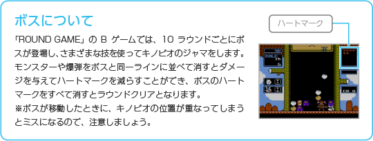 キノピオを操作して爆弾やモンスターを動かしましょう。ステージ内にいるすべてのモンスターを消すとラウンドクリアです。 降ってくるコインを拾って、次のステージへ向かってください。 ※降ってくるコインの量は、クリアにかかった時間によって変わります。 |
