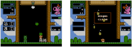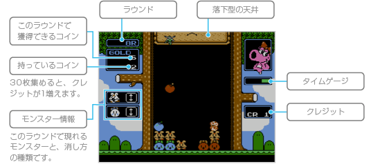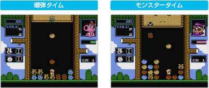プレイ中はタイムゲージが少しずつ伸びていき、ゲージがいっぱいになると色が緑色←→ピンク色に交互に変わります。 タイムゲージが緑色の間は「爆弾タイム」で、爆弾のみが降ってきます。 タイムゲージがピンク色の間は「モンスタータイム」で、モンスターが降ってくると同時に、ワリオが天井を下げてきます。天井が下がるとキノピオの動ける範囲が狭くなるので、気をつけましょう。 |