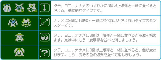 ゲームを進めると、ただ爆弾と一緒に並べるだけでは消えない、手強いモンスターが現れます。モンスターの消しかたは、画面のモンスター情報に表示されるアイコンで確認しましょう。