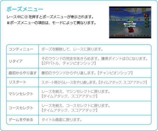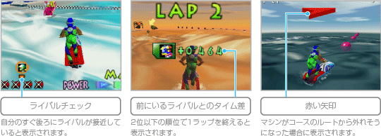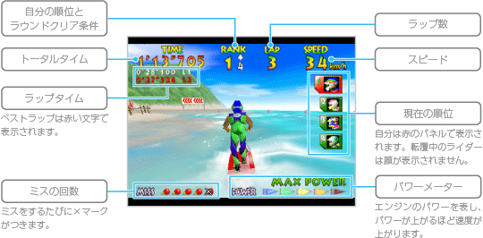 マシンを操縦して水上のコースを走り、ゴールをめざしましょう。 |