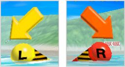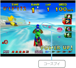 コース上には、赤と黄の「ルートブイ」が浮かんでいます。赤のブイは右側を、黄のブイは左側を通過しましょう。正しく通過するとパワーメーターが1増え、速度が上がります。ただし、通過できないとミスになり、パワーメーターは0に戻ってしまいます。5回ミスをすると、レースはリタイアとなってしまうので注意しましょう。 |