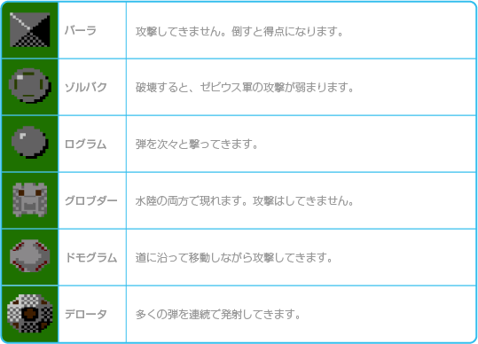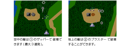 戦闘機ソルバルウを操作して、敵を倒しながらエリアを進みます。 空中の敵はザッパー、地上の敵はブラスターで攻撃してください。 また、いくつかのエリアを進むと、敵の浮遊要塞アンドアジェネシスが出現します。 ![]() |