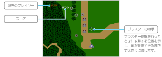 ゲーム中のフィールドはいくつかの「エリア」に分かれ、エリアとエリアの間は森で区切られています。 ![]() ※ブラスター攻撃では、照準をうまく合わせれば、一度に複数の敵を破壊することもできます。 |