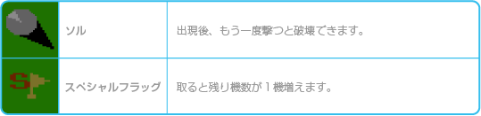 フィールド上には「ソル」や「スペシャルフラッグ」などの隠しキャラが隠れており、ブラスターで撃つと発見することができます。 ソルを破壊したりスペシャルフラッグを撃つと、さまざまなボーナスが手に入るので、何もない場所でもブラスターを撃ってみましょう。 ※ソルは隠れている状態でもブラスターの照準に反応します。 |