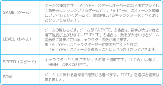 上から4種類のキャラクターと2種類のたまごのかけらが落ちてきます。 ![]() |