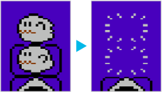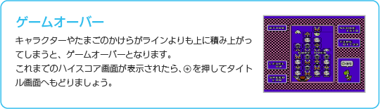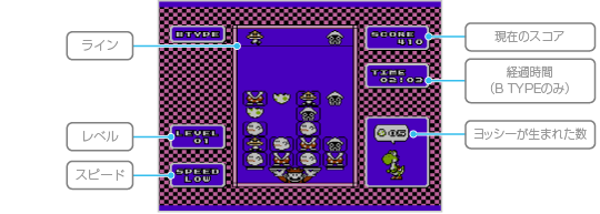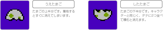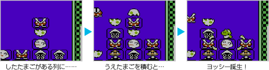 たまごのかけらには、「うえたまご」と「したたまご」の2種類があります。「したたまご」と同じ列の上に「うえたまご」を積むと、たまごのかけらが合体してヨッシーが生まれます。 ![]() ![]() |