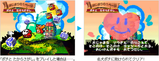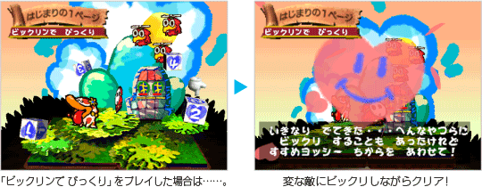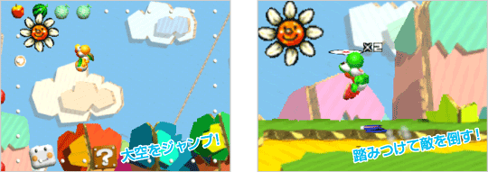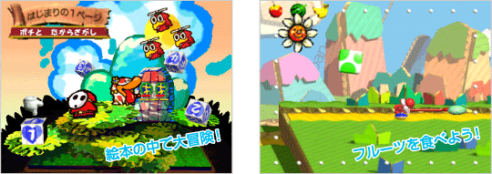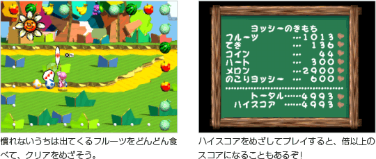 『ヨッシーストーリー』は単純に「ゴールをめざす」のではなく、「コース内にたくさんあるフルーツのうち、30個を手に入れる」ことでコースクリアとなります。「ゲームに慣れないうちは、どんどんフルーツを集めてクリア」「ゲームに慣れたら、ハイスコアをめざしてクリア」など、自分に合わせた方法で楽しむことができるのです。 ![]() |