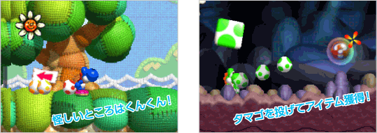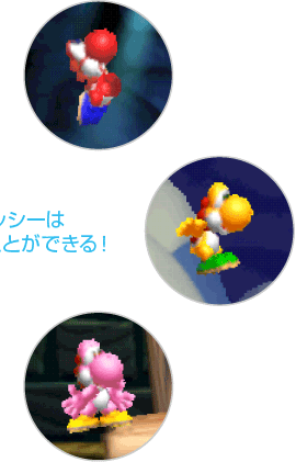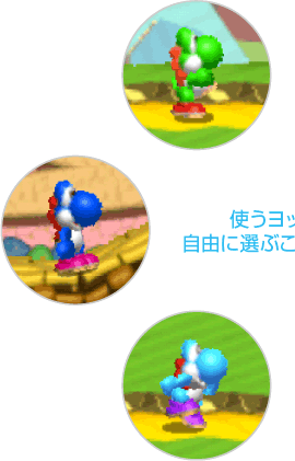 本ゲームには6色のヨッシーが登場! おなじみの緑色はもちろんのこと、スーパーファミコンソフト『スーパーマリオワールド』に登場した赤色/青色/黄色に加え、ピンク色に水色まで……。このほかにも特別な色のヨッシーがいるという噂も!? ![]() ![]() |