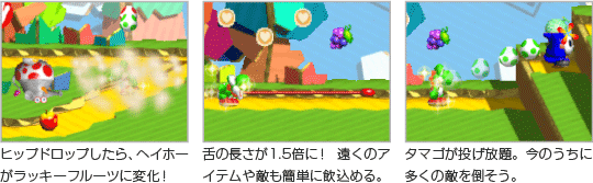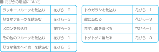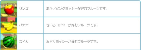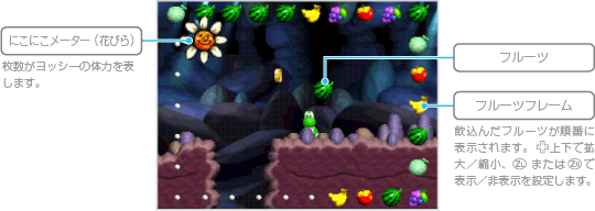 ヨッシーがフルーツを飲込むと、花びらが増えます。ヨッシーは色によって好きなフルーツが異なり、好きなフルーツを飲込んだときは、ほかのフルーツを飲込んだときより、花びらが多く増えます。また、きょうのラッキーフルーツを飲込んだときは、花びらが最大になります。 ![]() ![]() |