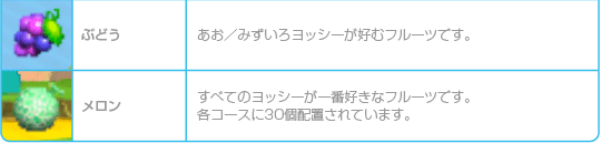 ヨッシーを操作してコース内を進みましょう。フルーツを合計30個飲込むとコースクリアです。 なお、 ![]() |