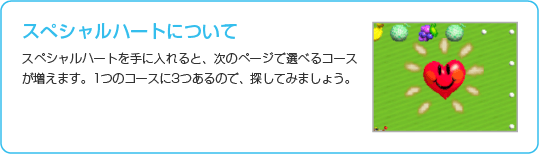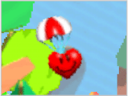 同じフルーツを6個連続で飲込むと、ハートフルーツが出現します。これを飲込むと一定時間強力なスーパーにこにこヨッシーになり、敵に当たってもダメージを受けなくなります。ほかにもさまざまな効果があるので、うまく活用しましょう。 |