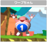 コースにはワープちゃんと呼ばれるキャラクターが4体いて、それぞれ1〜4の番号がついています。寝ているワープちゃんを見つけたら、ジャンプして踏みつけて起こしましょう。起こしたワープちゃんに乗ってジャンプすると、すでに起こしたほかのワープちゃんのところに移動できます。 |