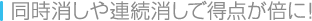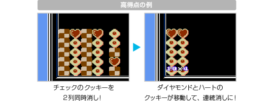 | クッキーを1列消すと、得点が入ります。このとき複数の列のクッキーを同時に消す「同時消し」や、クッキーが消えたあと、列がつまることによって別の列のクッキーが消える「連続消し」をすると、得点が倍になります。一度に多くの列を消したり、さらに連続してクッキーを消すと、得点が4倍、8倍……と、さらに増えていきます。 操作に慣れてきたら積極的に同時消しや連続消しをして、高得点をねらってみましょう。 |