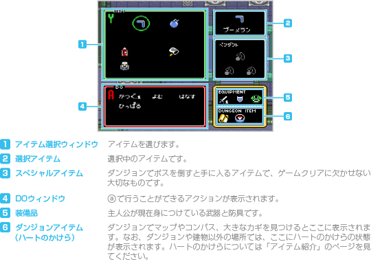 冒険を進めていくと、主人公が身につける装備品が手に入ります。装備品には剣や盾、服、ペガサスの靴などがあり、身につけることでパワーアップしたり、さまざまなアクションが行えるようになります。 |