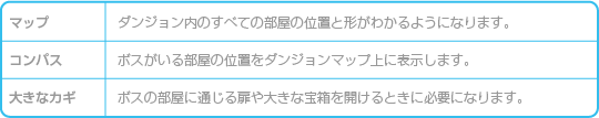 宝箱で手に入るダンジョンアイテムは以下の3つです。手に入れたダンジョンアイテムは、サブ画面で確認しましょう。 |