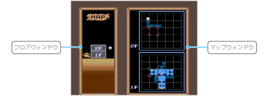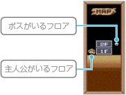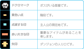 主人公の通った部屋が各フロアのマップに表示されていきます。また、ダンジョンアイテムのマップを手に入れると、行ったことのある部屋は明るく、まだ行ったことのない部屋は暗く表示されるので参考にしてください。なお、マップウィンドウには以下のアイコンも表示されます。 |