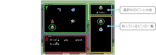 アイテムの一種「ビン」は、最大4つまで持つことができ、薬などを入れることができます。サブ画面でビンにカーソルを合わせると持っているビンの一覧が表示されるので、