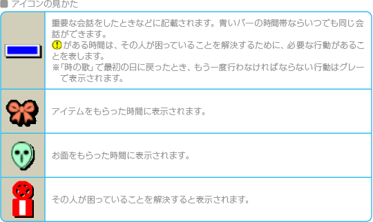 ※集めた情報は「時の歌」でセーブできますが、その人との会話などは初対面のときと同じ展開が繰り返されます。