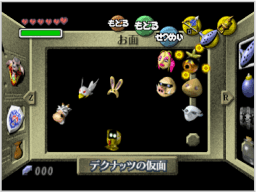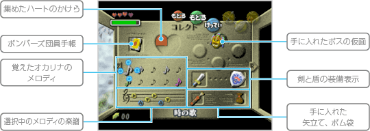 ゲームを進めるうえで重要なアイテムや、主人公が覚えたオカリナのメロディなどが表示されます。また、ボンバーズ団員手帳でこれまでにわかったスケジュールなどの確認をしたり、主人公の装備を確認することもできます。 ![]() |