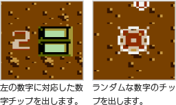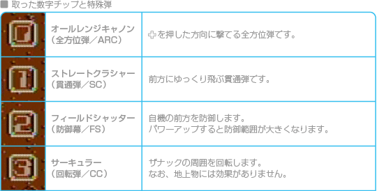 一部の地上物(右の写真)や、特定の敵を破壊すると、中から数字のチップが出現することがあります。これを取ると、特殊弾がチップに対応した武器に変化します。 |