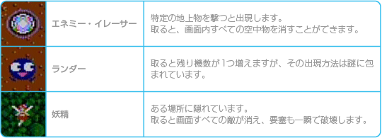 敵や地上物を破壊すると、さまざまなアイテムが出現することがあります。 アイテムを取ることによって自機がパワーアップしたり、さまざまな効果を得ることができます。 |